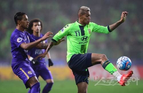 19일 전주월드컵경기장에서 2016 아시아축구연맹(AFC) 챔피언스리그(ACL) 결승 1차전 전북 현대와 알 아인(UAE)의 경기가 열렸다. 전반 전북 현대 로페즈가 알 아인 수비를 등지고 드리블을 하고 있다. 전주 | 김진환 기자 kwangshin00@donga.com