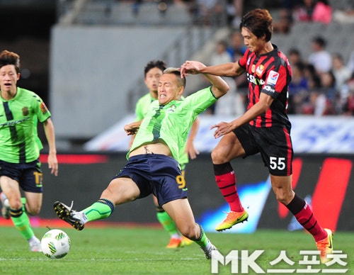 [매경닷컴 MK스포츠(상암) = 김재현 기자] 28일 서울월드컵경기장에서 벌어진 2016 K리그 클래식 28라운드 전북 현대와 FC서울의 경기에서 전북 김신욱이 서울 곽태휘의 수비에 앞서 볼을 처리하고 있다.