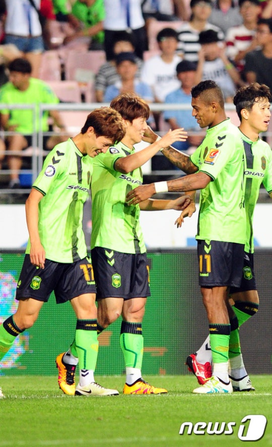 (전주=뉴스1) 문요한 기자 = 10일 오후 전북 전주시 전주월드컵경기장에서 열린 프로축구 2016 현대오일뱅크 K리그클래식 전북현대와 포항 스틸러스의 경기에서 두번째 골을 넣은 전북 김보경 선수가 로페즈와 하이파이브를 하고 있다.2016.7.10/뉴스1 yohan-m@