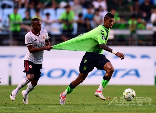30일 전주 월드컵경기장에서 열린 ‘현대오일뱅크 K리그 클래식 2016’ 전북 현대와 광주 FC의 경기에서 전북 로페즈가 돌파할 때 광주 파비오가 옷을 잡아당기고 있다. 전주 | 김민성 기자 marineboy@donga.com
