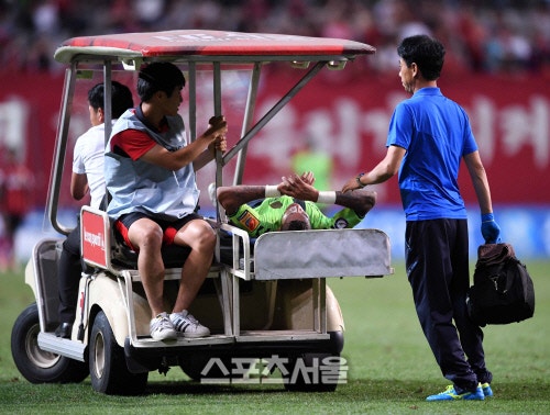 전북의 로페즈가 부상을 입고 들것에 실려 나가고 있다.